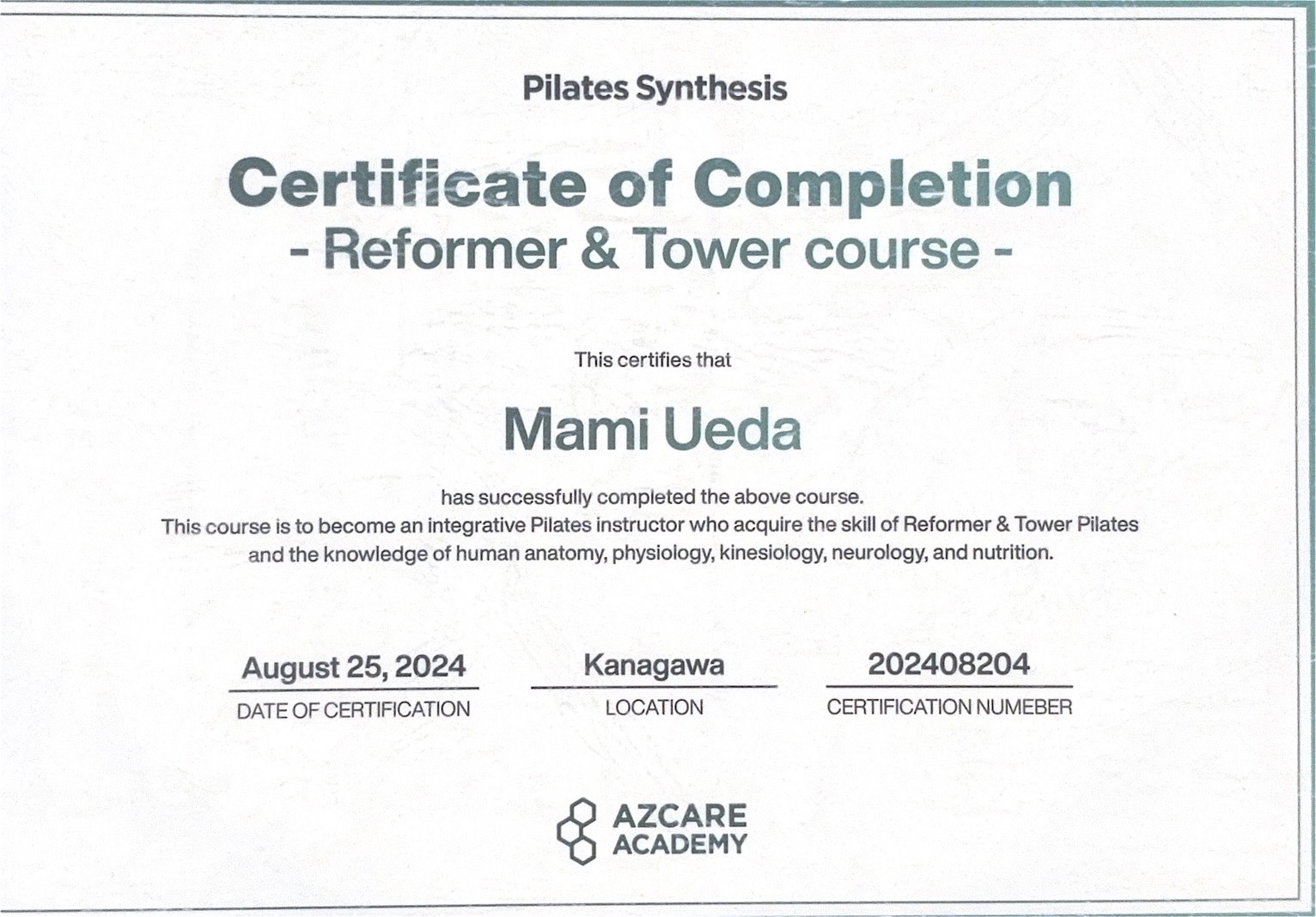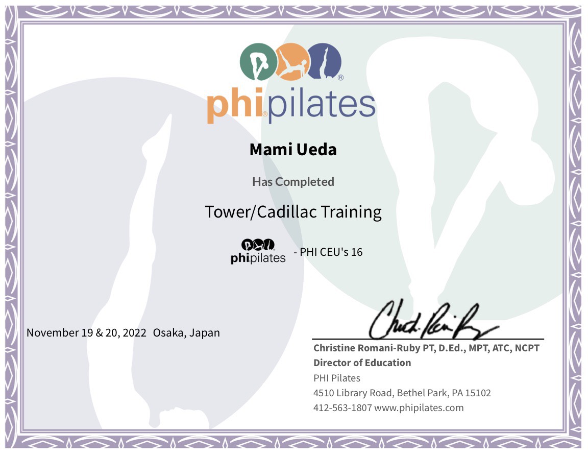 Pilates Synthesis Certificate of Completion Reformer & Tower